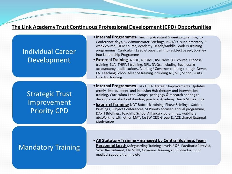 The Link Academy Trust believe in 'Opportunities for All' and recognise that the importance of continued learning and training is the best way for all our staff to develop the skills they need to progress in their employment with us.