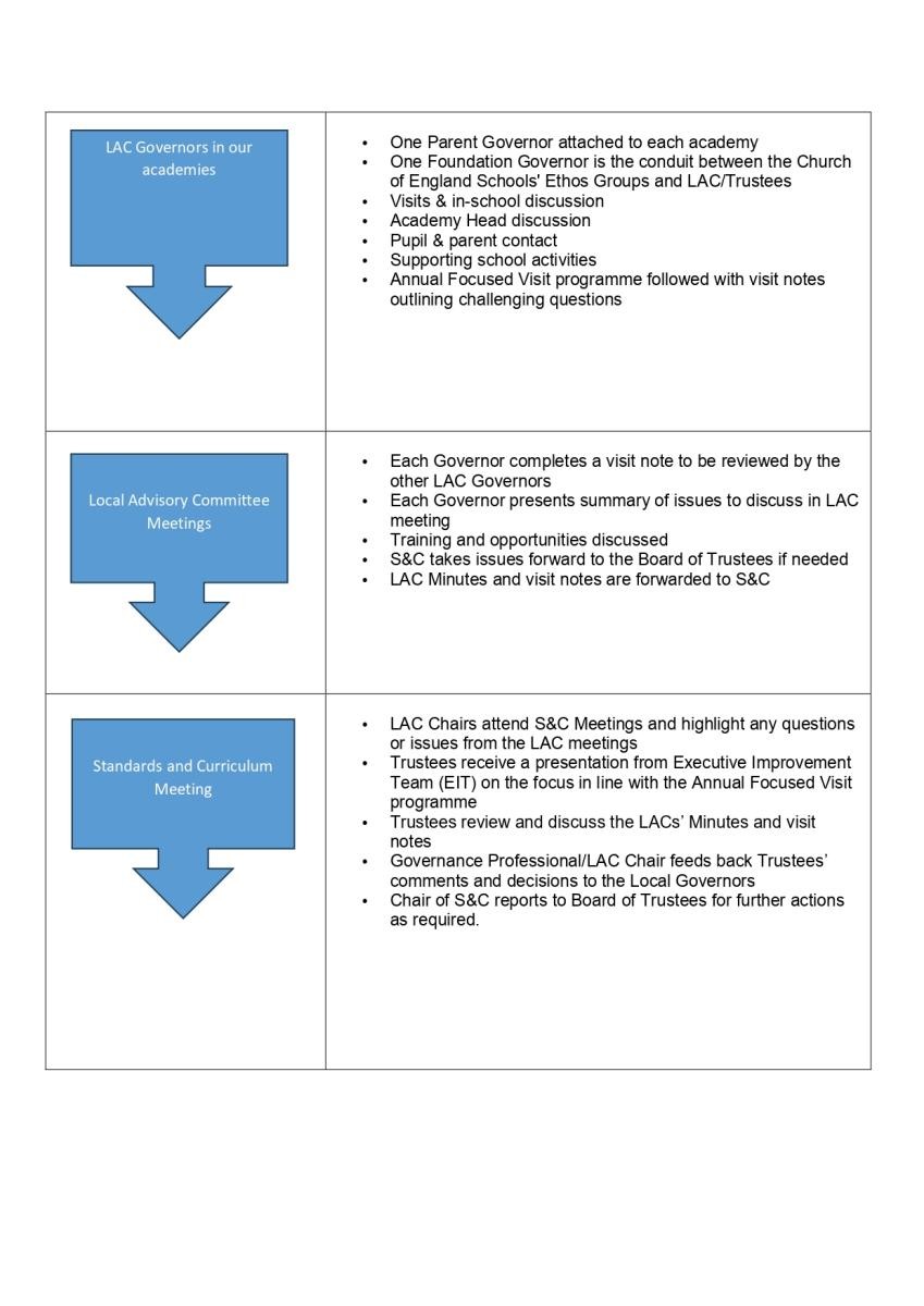 The Chair from each LAC is expected to attend the Standards and Curriculum Meeting. This meeting gives a platform for Trustees to learn, support and challenge LAC members in their work, seek further clarification and request further action if necessary. The minutes from the Standards and Curriculum meeting will go to the Full Board meeting where they will be further scrutinised, and possible future action will be requested through the S&C committee. The minutes from the S&C Committee meetings are also shared in the following LAC meeting, therefore closing the cycle of information.